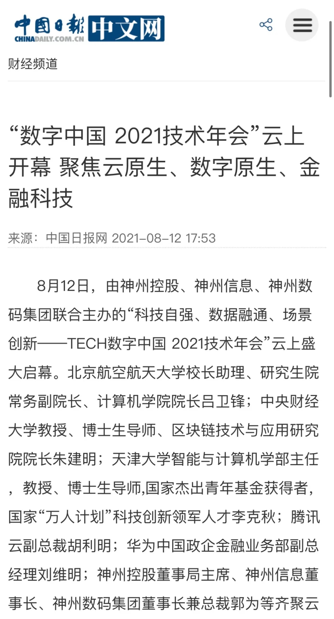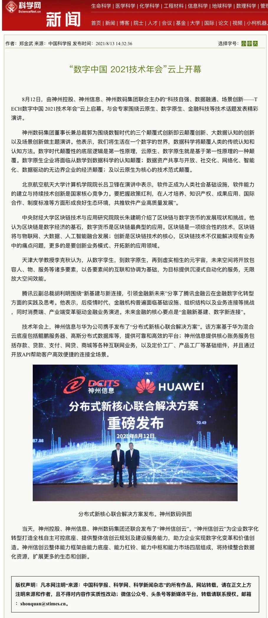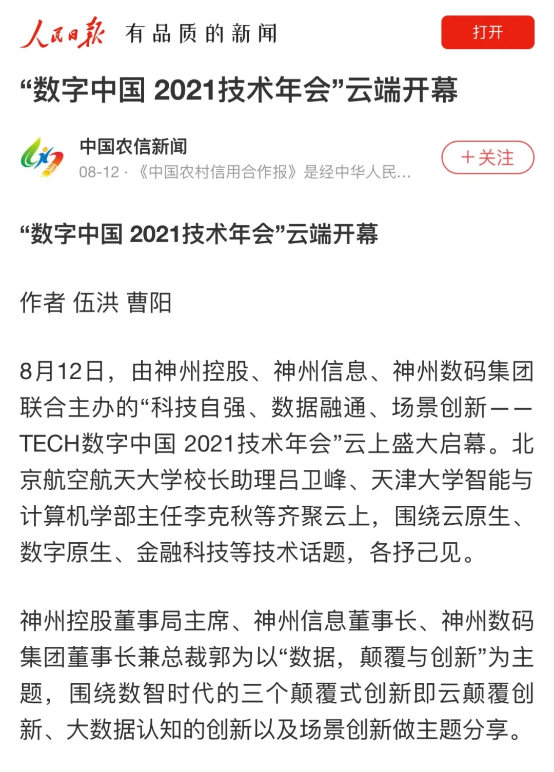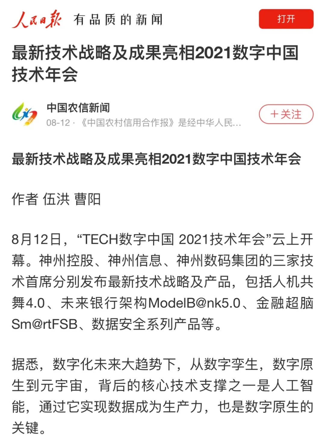 8月12日,由尊龙凯时人生就是博首页控股、尊龙凯时人生就是博首页信息、尊龙凯时人生就是博首页数码集团联合主办的“科技自强、数据融通、场景创新——TECH数字中国 2021技术年会”云上盛大启幕,发布尊龙凯时人生就是博首页信创云、ModelB@nk5.0、金融超脑Sm@rtFSB、云原生数字化安全底座、园区智能体等重磅产品,国内各大权威、影响力媒体多角度多频次对盛况进行报道!