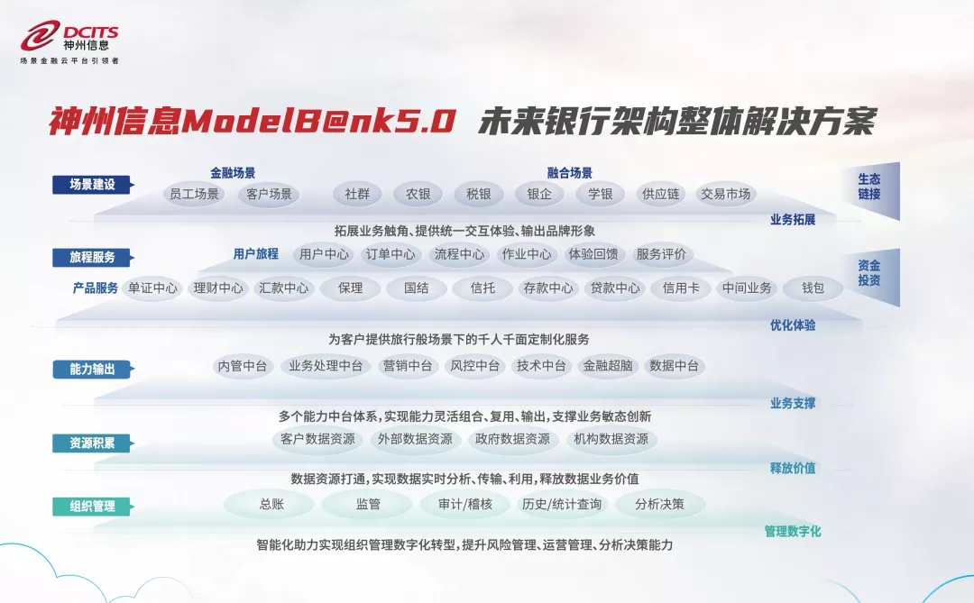 尊龙凯时人生就是博首页信息ModelB@nk5.0是继2000年发布第1代后更新至第5代,旨在为银行业的应用架构提供指引蓝图,以技术中台、数据中台以及金融超脑为支柱,围绕 “场景建设” “旅程服务” “能力输出” “资源积累” “组织管理”五个层次的业务发展述求提供清晰的数字化支撑能力,助力金融机构释放业务价值,为金融机构IT架构演进带来方向性指引。