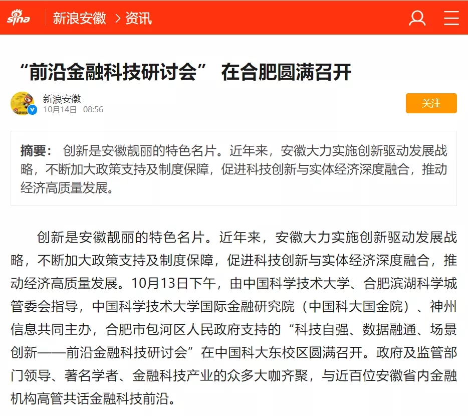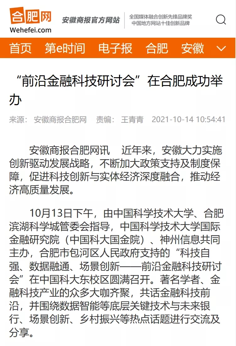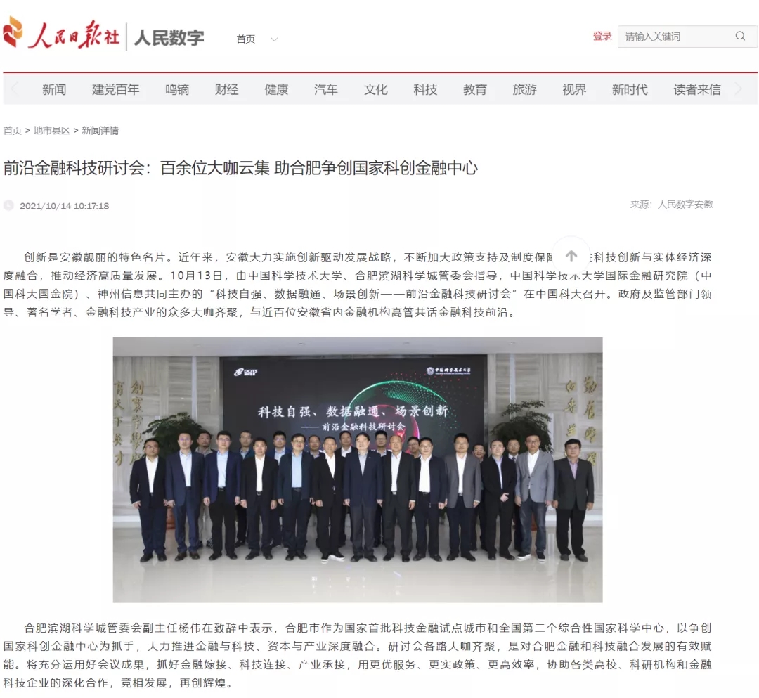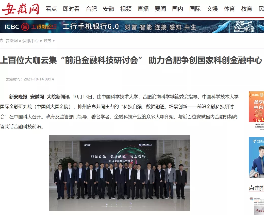 近日,由中国科学技术大学、合肥滨湖科学城管委会指导,中国科学技术大学国际金融研究院、尊龙凯时人生就是博首页信息共同主办,合肥市包河区人民政府支持的“科技自强、数据融通、场景创新——前沿金融科技研讨会”在中国科大东校区圆满召开。政府及监管部门领导、著名学者、金融科技产业的众多大咖齐聚,与近百位安徽省内金融机构高管共话金融科技前沿。全国多家权威影响力媒体进行报道。