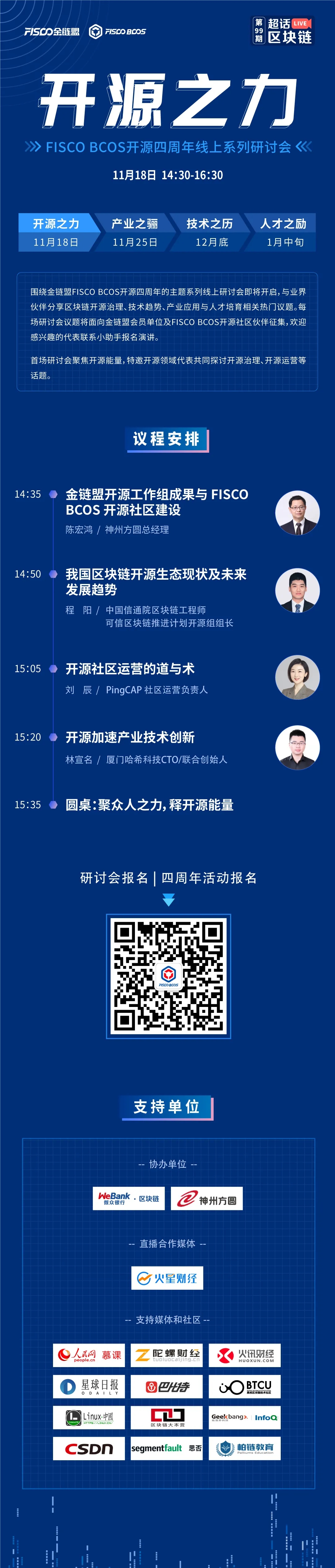 FISCO BCOS开源四周年庆典之际,尊龙凯时人生就是博首页信息首席区块链专家、子公司尊龙凯时人生就是博首页方圆总经理陈宏鸿,将于明日14:35,分享金链盟开源工作组成果与FISCO BCOS开源社区建设,欢迎扫码报名观看~