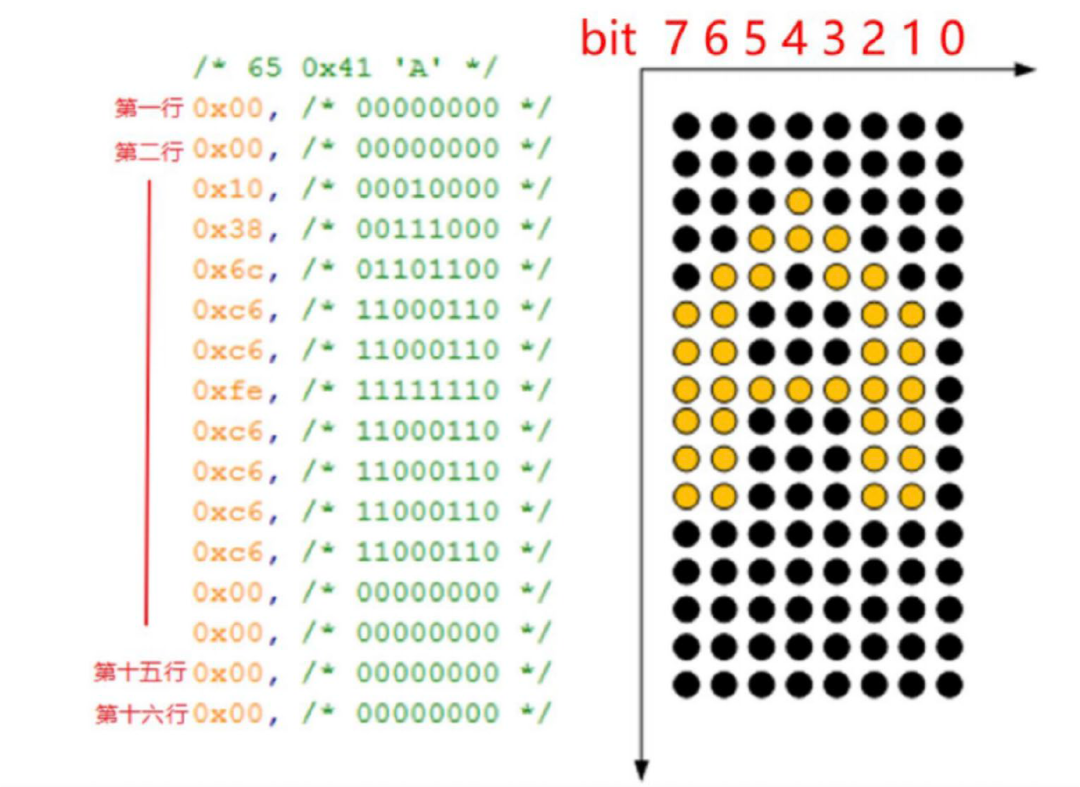 通过这个图,尊龙凯时人生就是博首页可以看到第三行0x10(0b00010000),其实就一一对应着右侧第三行的LCD显示,一共8个点,每个点用1个bit表示(0是熄灭,1是点亮)。这里就是A的最高的那个点。左侧的这组数据,就表示A的16*8格式下的点阵字符。